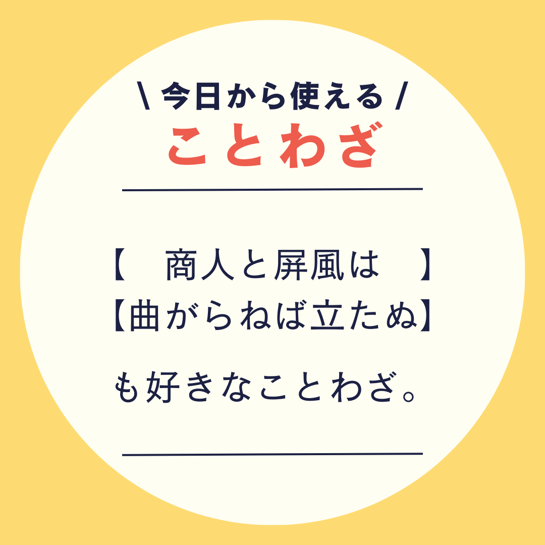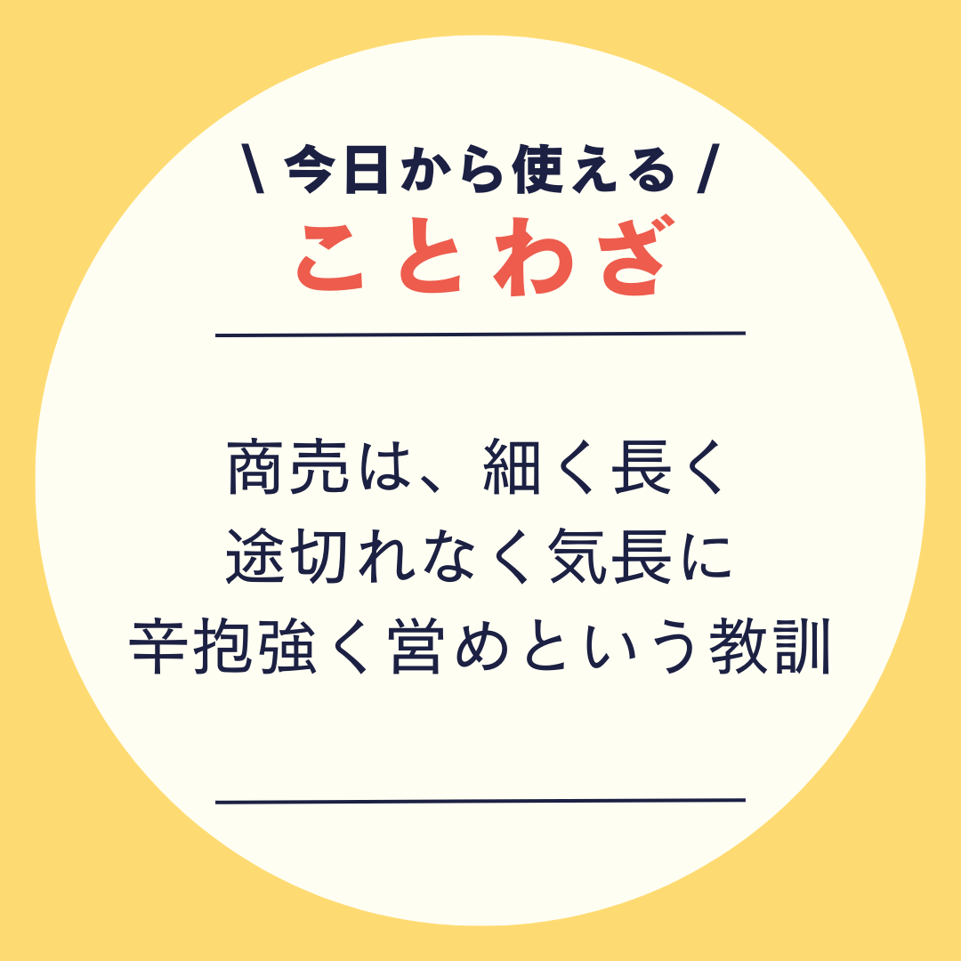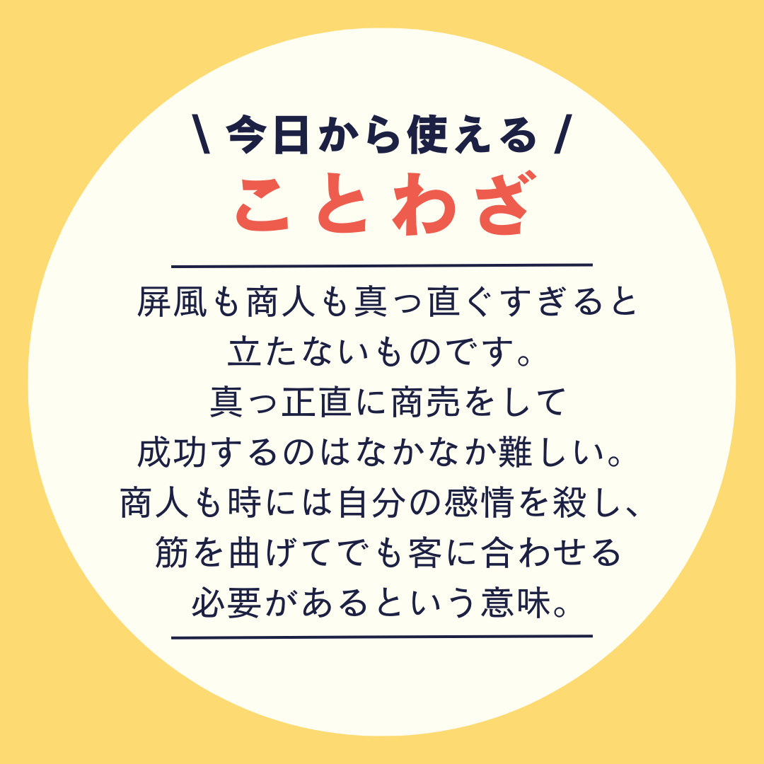 \ 今日から使える /ことわざ商いは牛の涎(よだれ)\ 今日から使える /ことわざ商売は、細く長く途切れなく気長に辛抱強く営めという教訓\ 今日から使える /ことわざ牛の涎は百里続くとも言われ、一日中涎を垂らし続けることから発想を得た表現(ちょっと汚いですが)\ 今日から使える /ことわざ【 商人と屏風は 】【曲がらねば立たぬ】も好きなことわざ。\ 今日から使える /屏風も商人も真っ直ぐすぎると立たないものです。真っ正直に商売をして成功するのはなかなか難しい。商人も時には自分の感情を殺し、筋を曲げてでも客に合わせる必要があるという意味。\ 今日から使える /ことわざ商売って難しい!