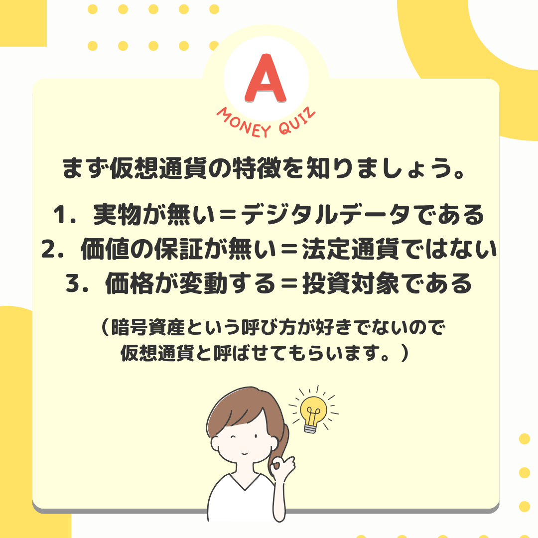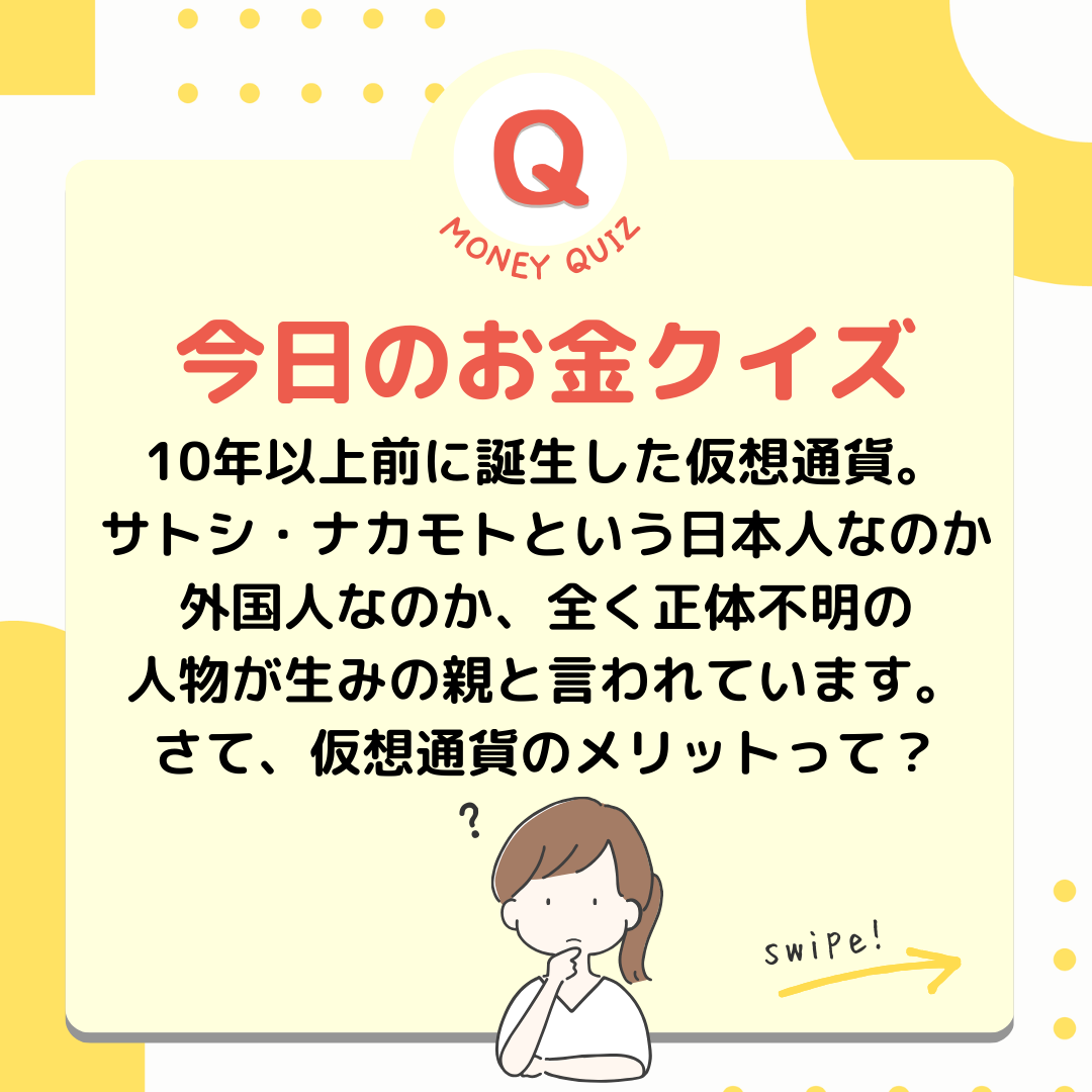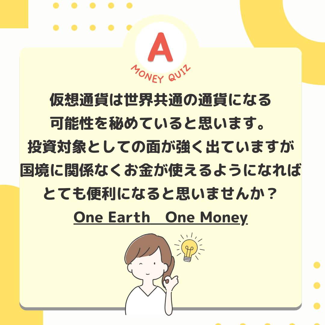 今日のお金クイズ暗号資産って?(仮想通貨って?)今日のお金クイズ10年以上前に誕生した仮想通貨。サトシ・ナカモトという日本人なのか外国人なのか、全く正体不明の人物が生みの親と言われています。さて、仮想通貨のメリットって?送金が簡単?手数料が安い?少額から投資できる?24時間利用できる?市場として魅力がある?全部正解!まず仮想通貨の特徴を知りましょう。1.実物が無い=デジタルデータである2.価値の保証が無い=法定通貨ではない3.価格が変動する=投資対象である(暗号資産という呼び方が好きでないので仮想通貨と呼ばせてもらいます。)1.お札や硬貨のように目には見えな2.価値が0になることもあるが誰も助けてくれない3.金(きん)のように世界共通の存在のため投資対象となる1.【データ】を利用者同士で監視し合う2.仮想通貨発行業者が倒産することも(その仮想通貨は無価値となり、取引もできなくなる)3.価格の変動が大きいため 投資というより【投機】に近いマイナスな部分ではなく、メリットは・・・★銀行が間に入らないので海外送金などの手続きが即座にできる★銀行をが間に入らないので為替手数料がかからない★新興市場のため今後の成長に期待ができる仮想通貨は世界共通の通貨になる可能性を秘めていると思います。投資対象としての面が強く出ていますが国境に関係なくお金が使えるようになればとても便利になると思いませんか?One Earth One Money