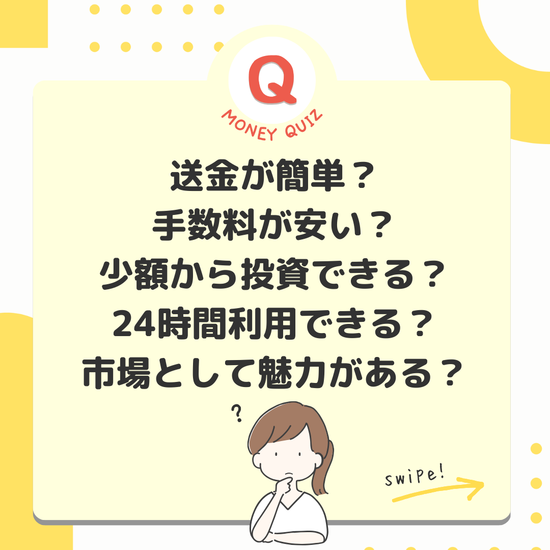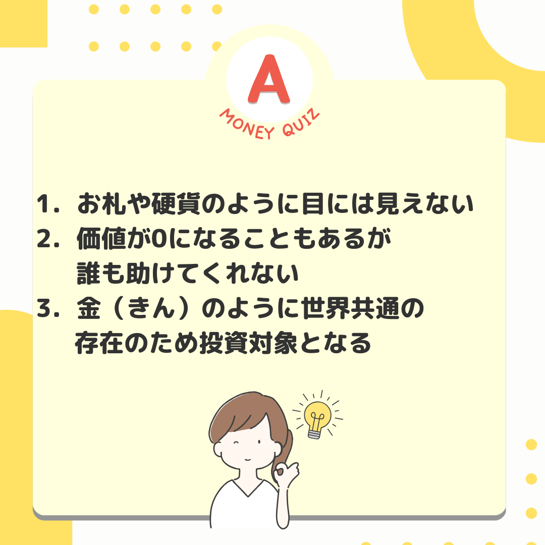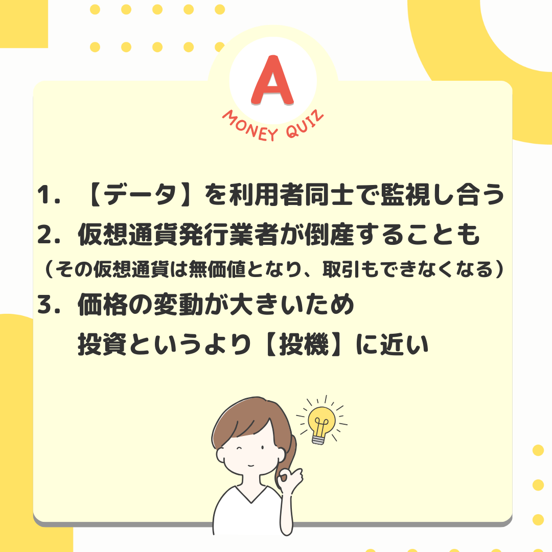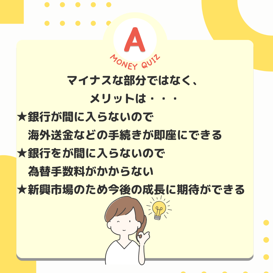 今日のお金クイズ暗号資産って?(仮想通貨って?)今日のお金クイズ10年以上前に誕生した仮想通貨。サトシ・ナカモトという日本人なのか外国人なのか、全く正体不明の人物が生みの親と言われています。さて、仮想通貨のメリットって?送金が簡単?手数料が安い?少額から投資できる?24時間利用できる?市場として魅力がある?全部正解!まず仮想通貨の特徴を知りましょう。1.実物が無い=デジタルデータである2.価値の保証が無い=法定通貨ではない3.価格が変動する=投資対象である(暗号資産という呼び方が好きでないので仮想通貨と呼ばせてもらいます。)1.お札や硬貨のように目には見えな2.価値が0になることもあるが誰も助けてくれない3.金(きん)のように世界共通の存在のため投資対象となる1.【データ】を利用者同士で監視し合う2.仮想通貨発行業者が倒産することも(その仮想通貨は無価値となり、取引もできなくなる)3.価格の変動が大きいため 投資というより【投機】に近いマイナスな部分ではなく、メリットは・・・★銀行が間に入らないので海外送金などの手続きが即座にできる★銀行をが間に入らないので為替手数料がかからない★新興市場のため今後の成長に期待ができる仮想通貨は世界共通の通貨になる可能性を秘めていると思います。投資対象としての面が強く出ていますが国境に関係なくお金が使えるようになればとても便利になると思いませんか?One Earth One Money