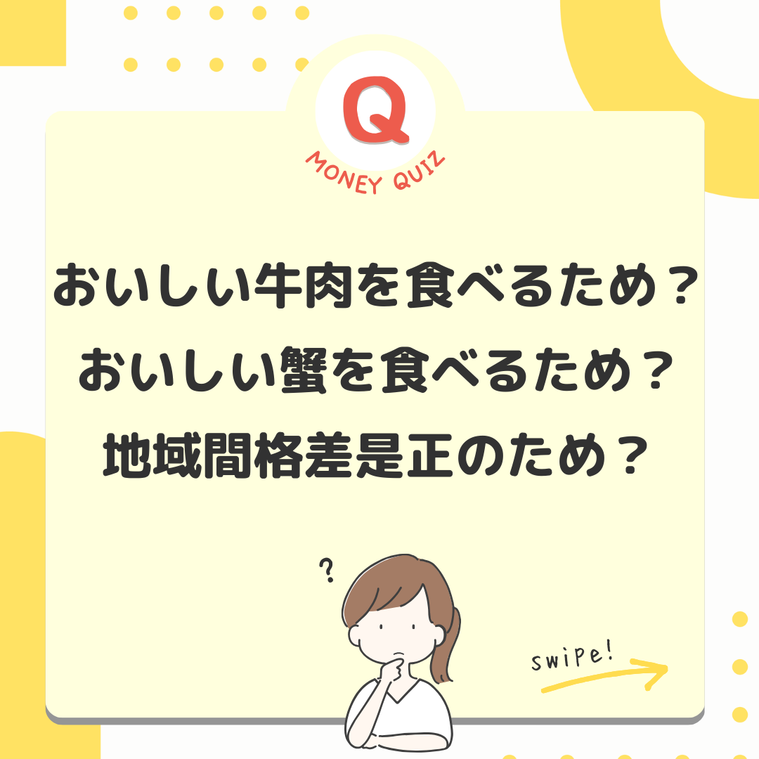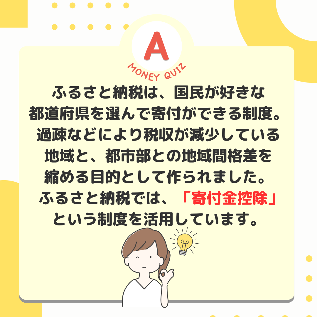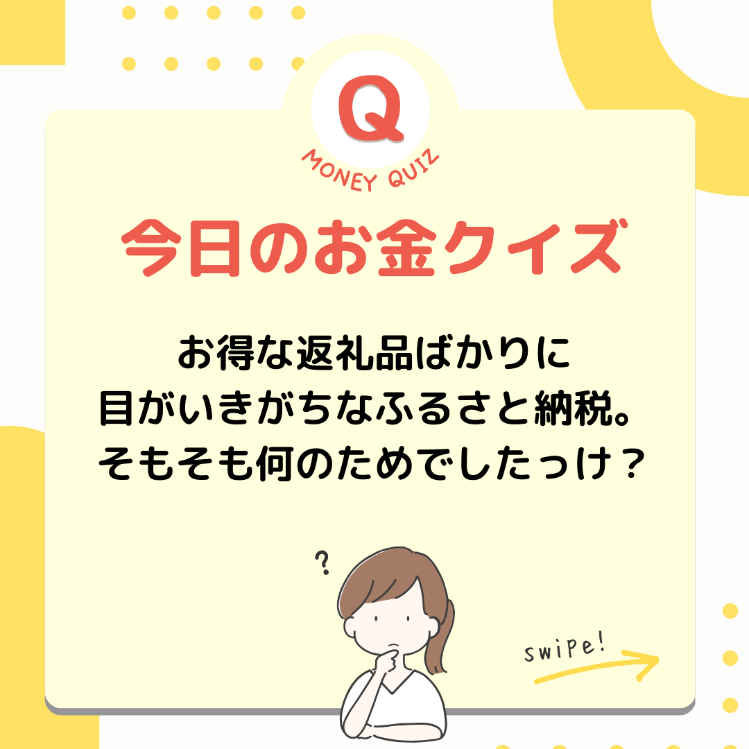 1px 白今日のお金クイズふるさと納税誰のために?何のために?今日のお金クイズお得な返礼品ばかりに目がいきがちなふるさと納税。そもそも何のためでしたっけ?おいしい牛肉を食べるため?おいしい蟹を食べるため?地域間格差是正のため?地域間格差是正のため!ふるさと納税は、国民が好きな都道府県を選んで寄付ができる制度。過疎などにより税収が減少している