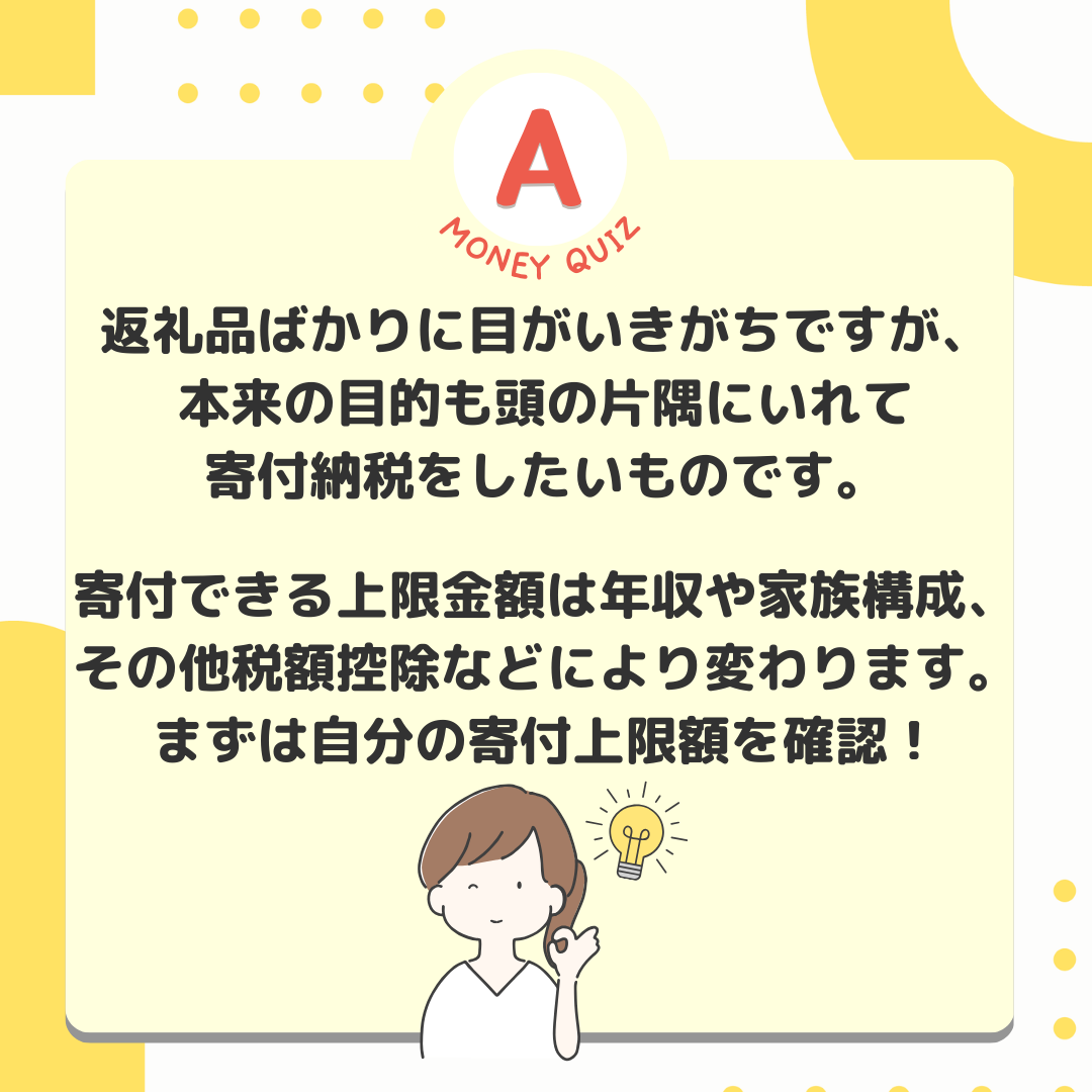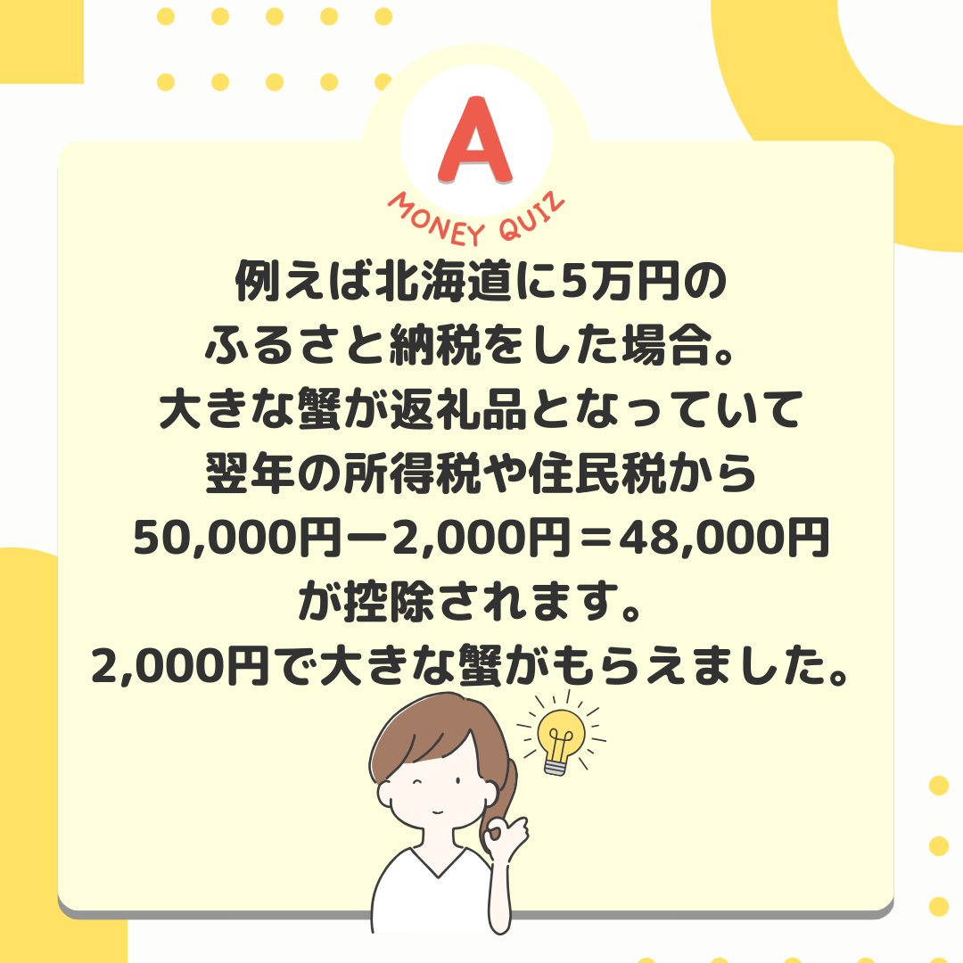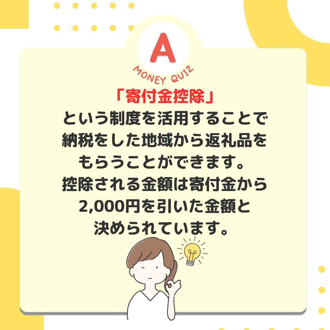 1px 白今日のお金クイズふるさと納税誰のために?何のために?今日のお金クイズお得な返礼品ばかりに目がいきがちなふるさと納税。そもそも何のためでしたっけ?おいしい牛肉を食べるため?おいしい蟹を食べるため?地域間格差是正のため?地域間格差是正のため!ふるさと納税は、国民が好きな都道府県を選んで寄付ができる制度。過疎などにより税収が減少している