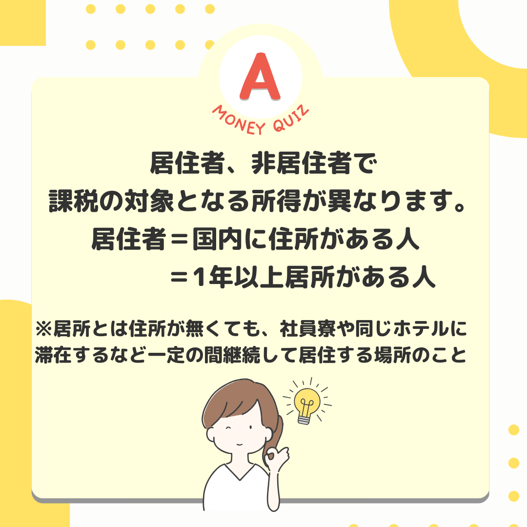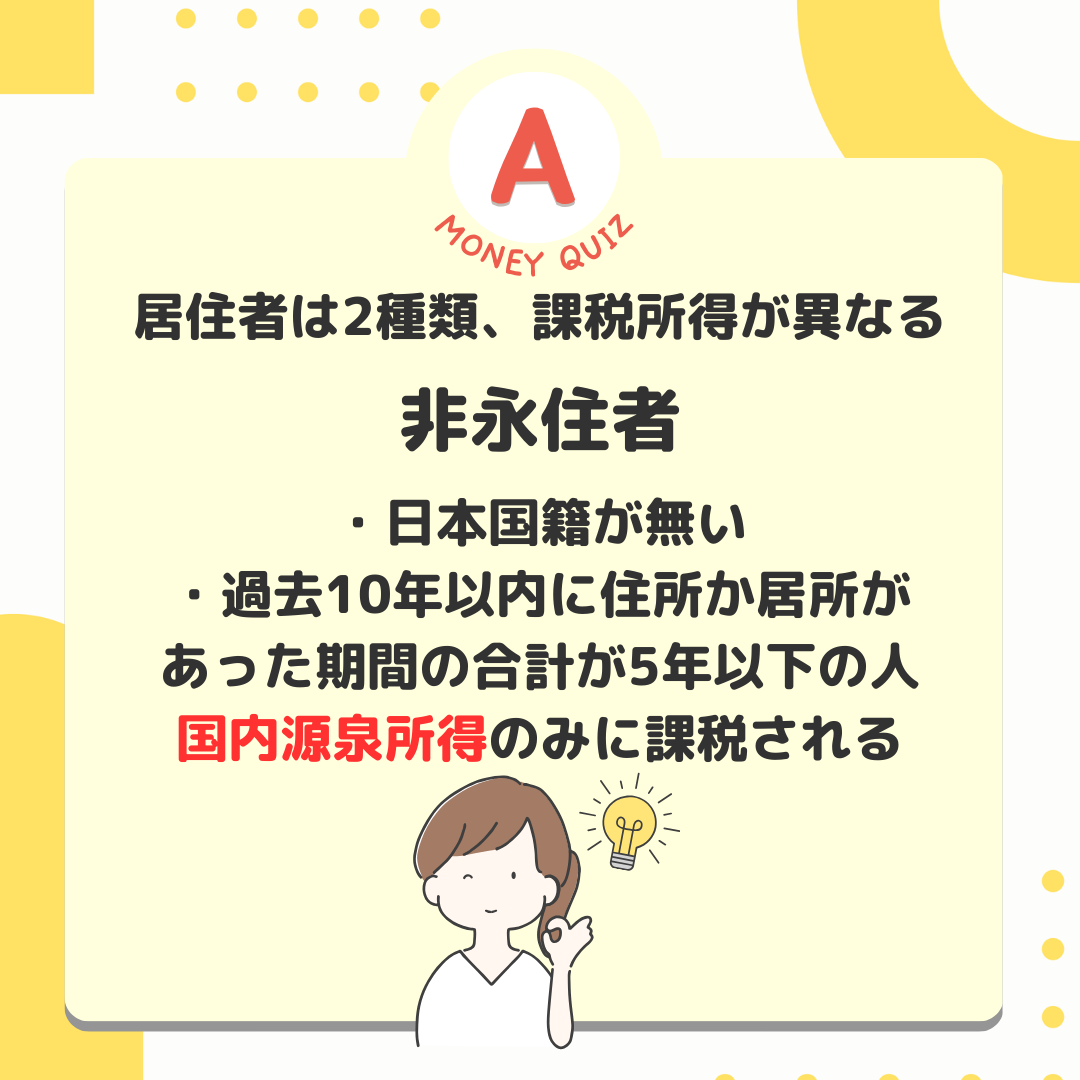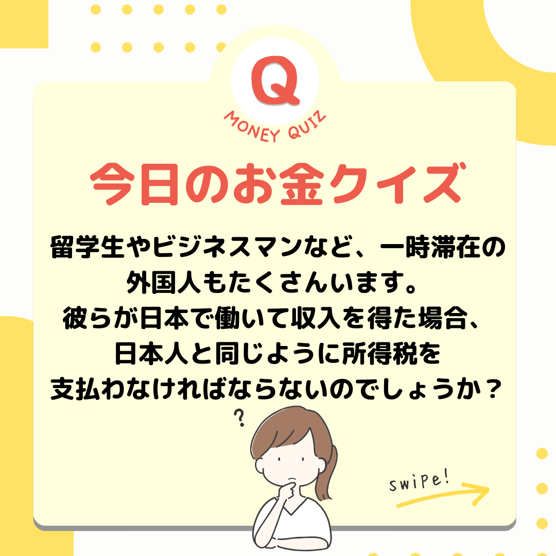 今日のお金クイズ外国人も所得税を払う?今日のお金クイズ留学生やビジネスマンなど、一時滞在の外国人もたくさんいます。彼らが日本で働いて収入を得た場合、日本人と同じように所得税を支払わなければならないのでしょうか?払う?払わない?What is 所得税?条件によって内容がなるが払う!居住者・永住者・非永住者非居住者・居住者以外居住者、非居住者で課税の対象となる所得が異なります。居住者=国内に住所がある人=1年以上居所がある人※居所とは住所が無くても、社員寮や同じホテルに滞在するなど一定の間継続して居住する場所のこと居住者は2種類で、課税所得が異なる永住者・非永住者以外の人国内外すべての所得に課税がされる居住者は2種類、課税所得が異なる非永住者・日本国籍が無い・過去10年以内に住所か居所があった期間の合計が5年以下の人国内源泉所得のみに課税される居住者は2種類、課税所得が異なる非永住者日本国籍が無い・過去10年以内に住所か居所があった期間の合計が5年以下の人国内源泉所得のみに課税される国内源泉所得とは=国内で働いて得た賃金や国内で保有していた株の配当金や国内の保有マンションの賃貸収入など国内源泉所得とは=国内で働いて得た賃金や国内で保有していた株の配当金や国内の保有マンションの賃貸収入など非居住者とは・居住者以外・国内に住所が無・1年以上の居所も無い国内源泉所得のみが対象