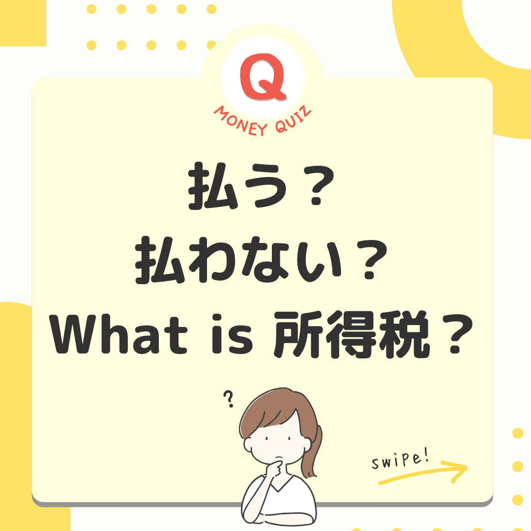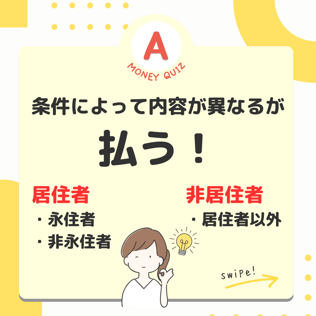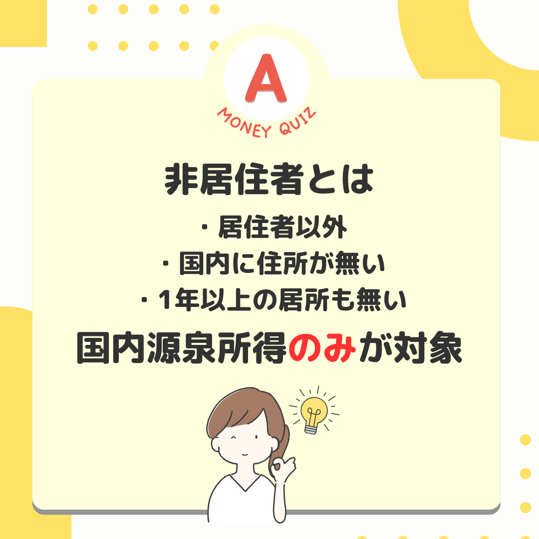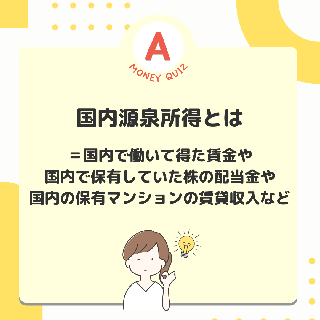 今日のお金クイズ外国人も所得税を払う?今日のお金クイズ留学生やビジネスマンなど、一時滞在の外国人もたくさんいます。彼らが日本で働いて収入を得た場合、日本人と同じように所得税を支払わなければならないのでしょうか?払う?払わない?What is 所得税?条件によって内容がなるが払う!居住者・永住者・非永住者非居住者・居住者以外居住者、非居住者で課税の対象となる所得が異なります。居住者=国内に住所がある人=1年以上居所がある人※居所とは住所が無くても、社員寮や同じホテルに滞在するなど一定の間継続して居住する場所のこと居住者は2種類で、課税所得が異なる永住者・非永住者以外の人国内外すべての所得に課税がされる居住者は2種類、課税所得が異なる非永住者・日本国籍が無い・過去10年以内に住所か居所があった期間の合計が5年以下の人国内源泉所得のみに課税される居住者は2種類、課税所得が異なる非永住者日本国籍が無い・過去10年以内に住所か居所があった期間の合計が5年以下の人国内源泉所得のみに課税される国内源泉所得とは=国内で働いて得た賃金や国内で保有していた株の配当金や国内の保有マンションの賃貸収入など国内源泉所得とは=国内で働いて得た賃金や国内で保有していた株の配当金や国内の保有マンションの賃貸収入など非居住者とは・居住者以外・国内に住所が無・1年以上の居所も無い国内源泉所得のみが対象
