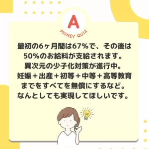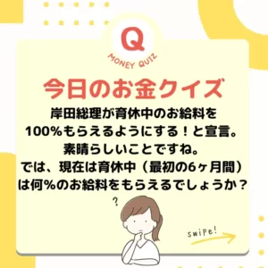 今日のお金クイズ岸田総理が育休中のお給料を100%もらえるようにする!と宣言。素晴らしいことですね。では、現在は育休中(最初の6ヶ月間)は何%のお給料をもらえるでしょうか?47%67%87%
