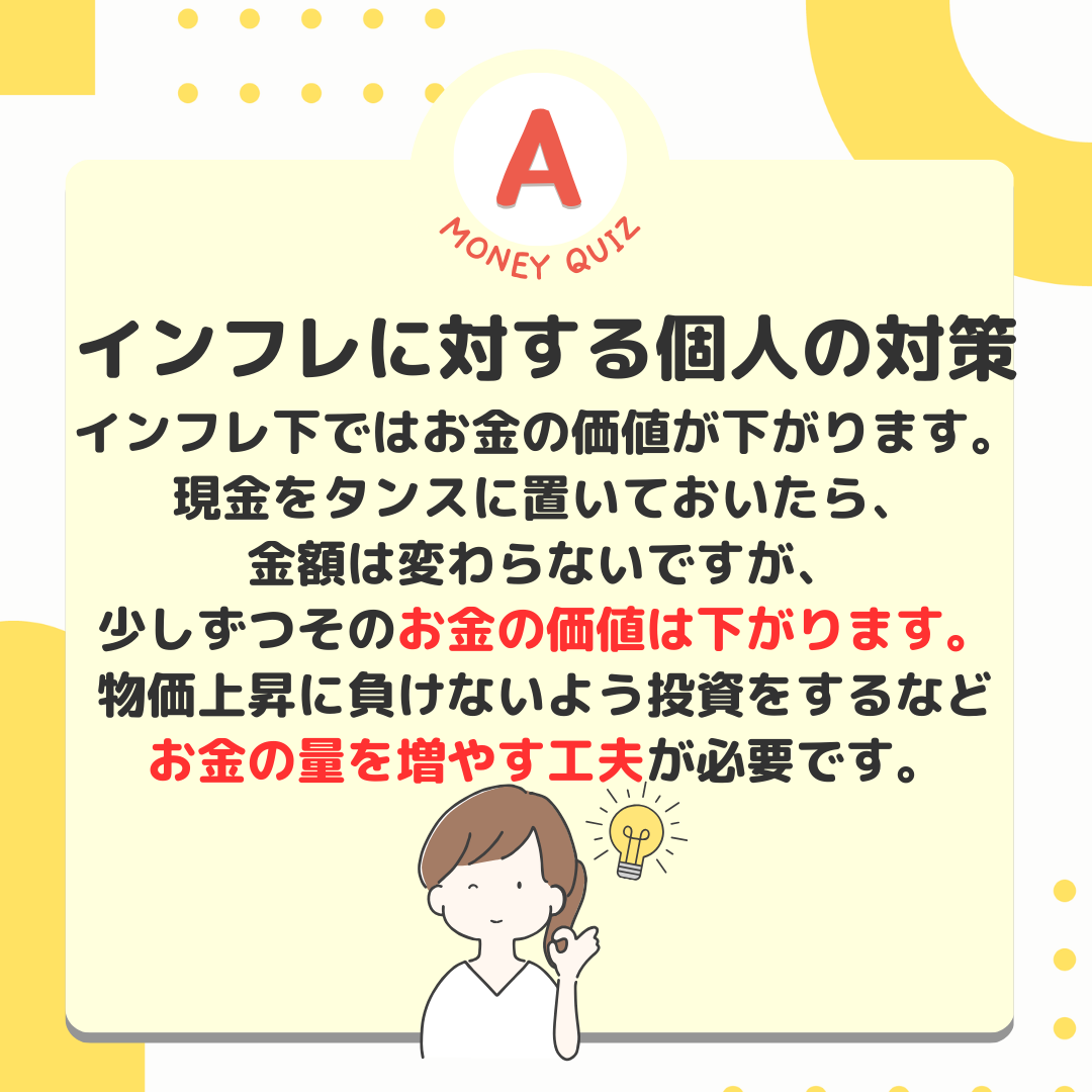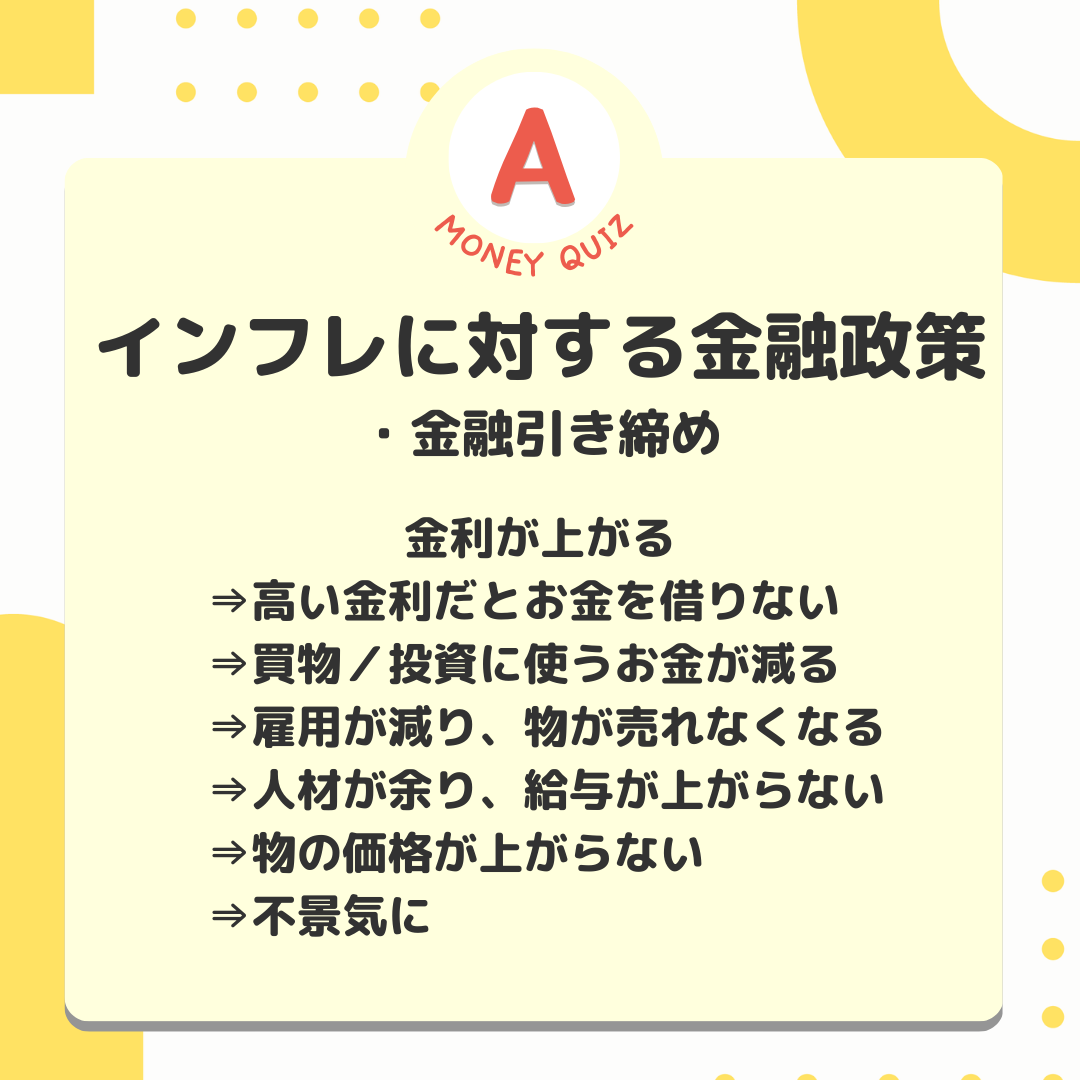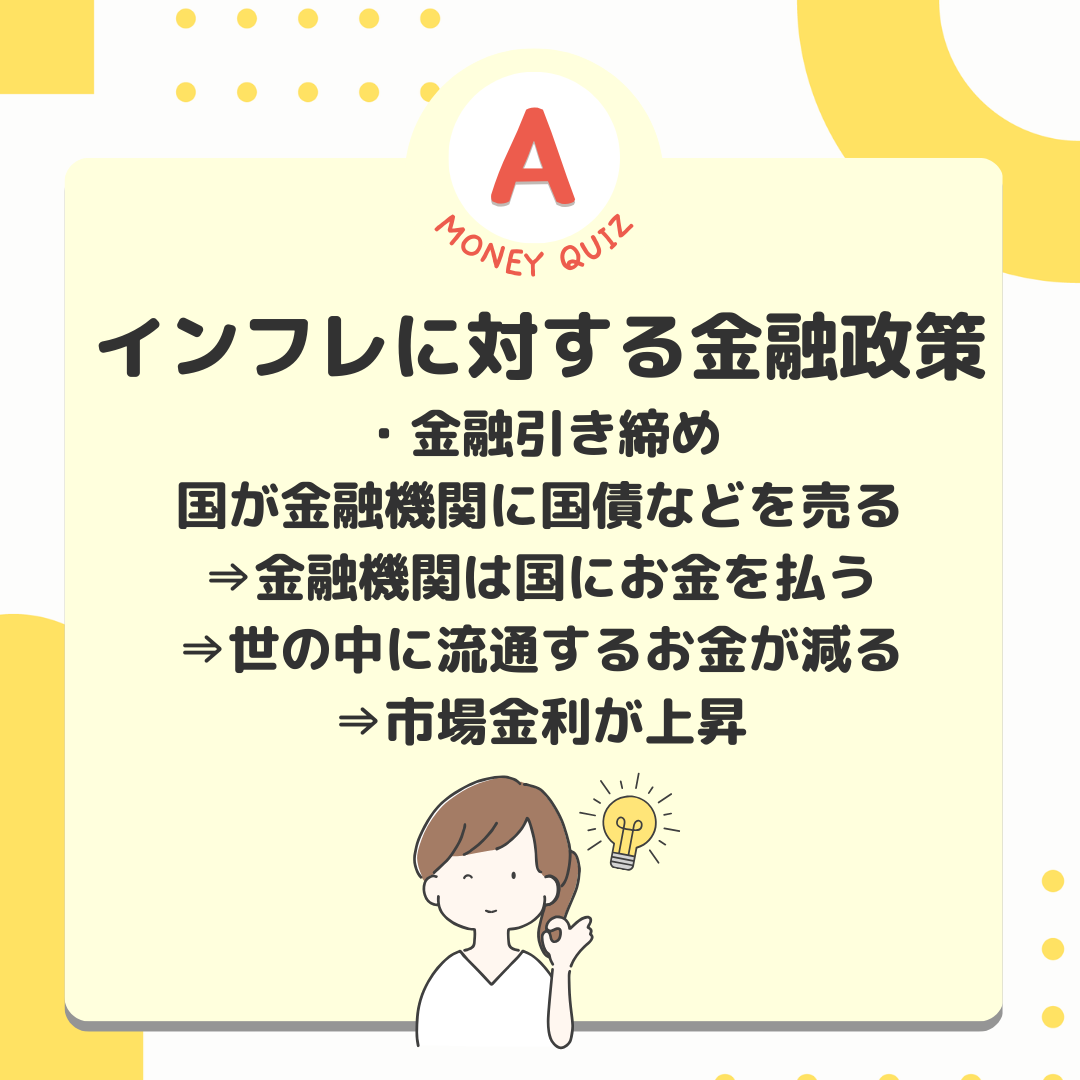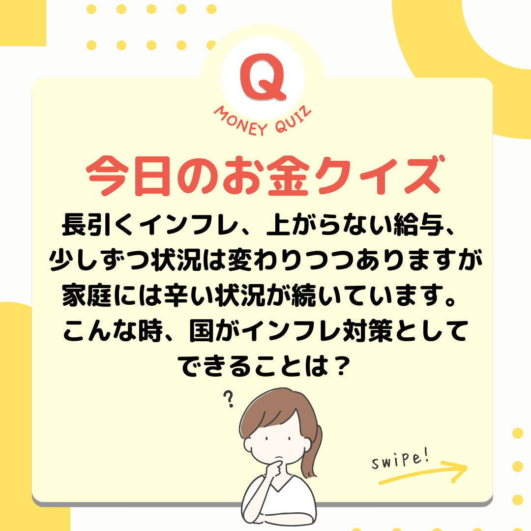 1px 白長引くインフレ、上がらない給与、少しずつ状況は変わりつつありますが家庭には辛い状況が続いています。こんな時、国がインフレ対策としてできることは?金利を上げる?金利を下げる?何もできない?金利を上げる!(金融引き締め)インフレのおさらい・物やサービスの価格が上がる・お金に対する信頼感が低下・需要が供給を上回る・物価上昇と給与上昇が伴えば適度な上昇は経済の成長に良い影響もインフレに対する金融政策・金融引き締め国が金融機関に国債などを売る⇒金融機関は国にお金を払う⇒世の中に流通するお金が減る⇒市場金利が上昇インフレに対する金融政策・金融引き締め金利が上がる⇒高い金利だとお金を借りない⇒買物/投資に使うお金が減る⇒雇用が減り、物が売れなくなる⇒人材が余り、給与が上がらない⇒物の価格が上がらない⇒不景気にインフレに対する個人の対策インフレ下ではお金の価値が下がります。現金をタンスに置いておいたら、金額は変わらないですが、少しずつそのお金の価値は下がります。物価上昇に負けないよう投資をするなどお金の量を増やす工夫が必要です。