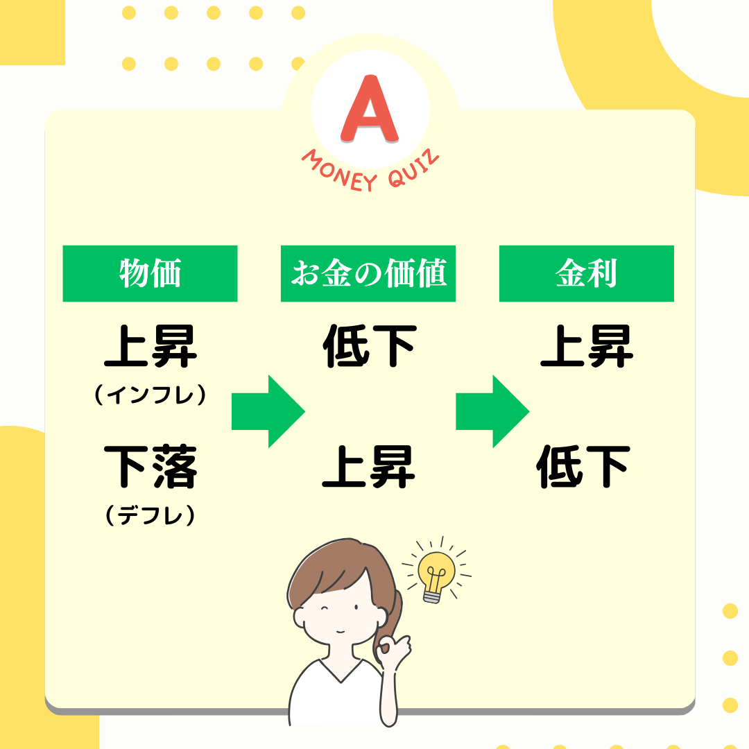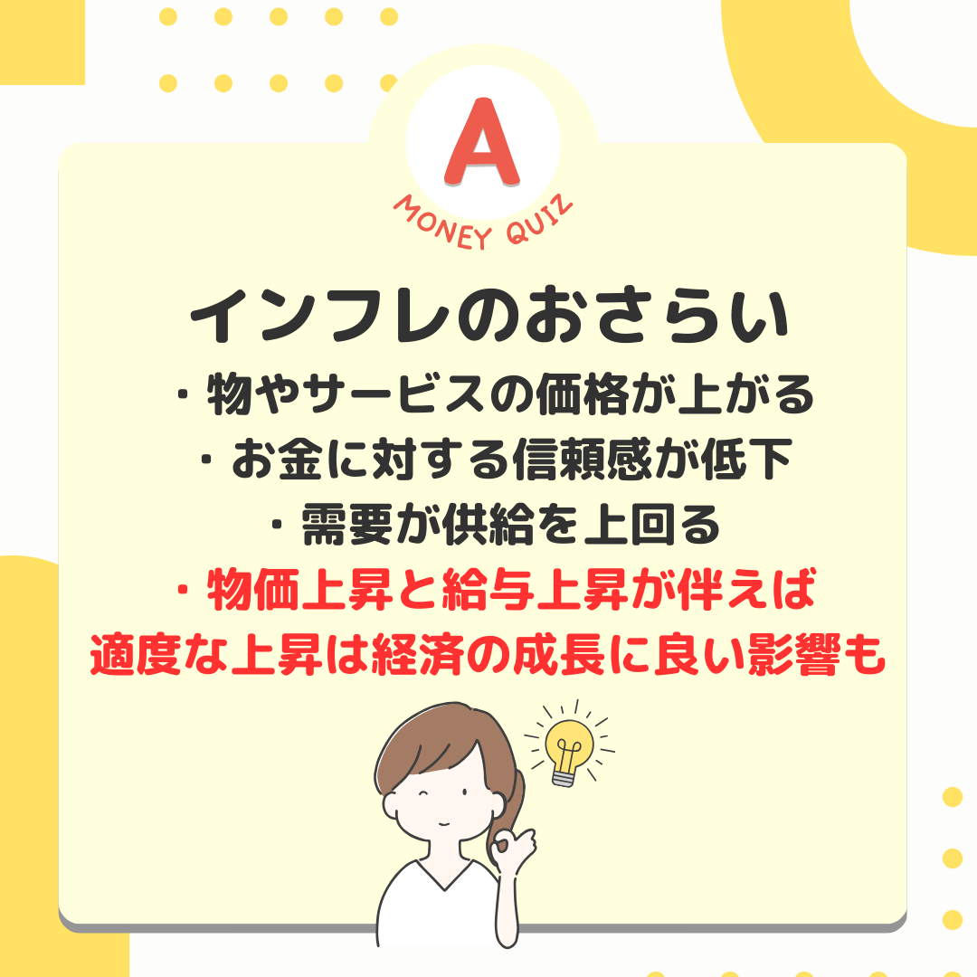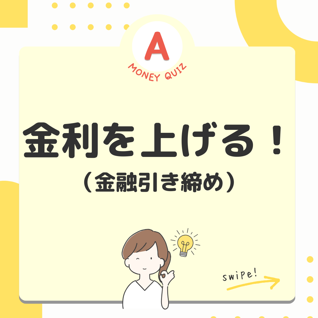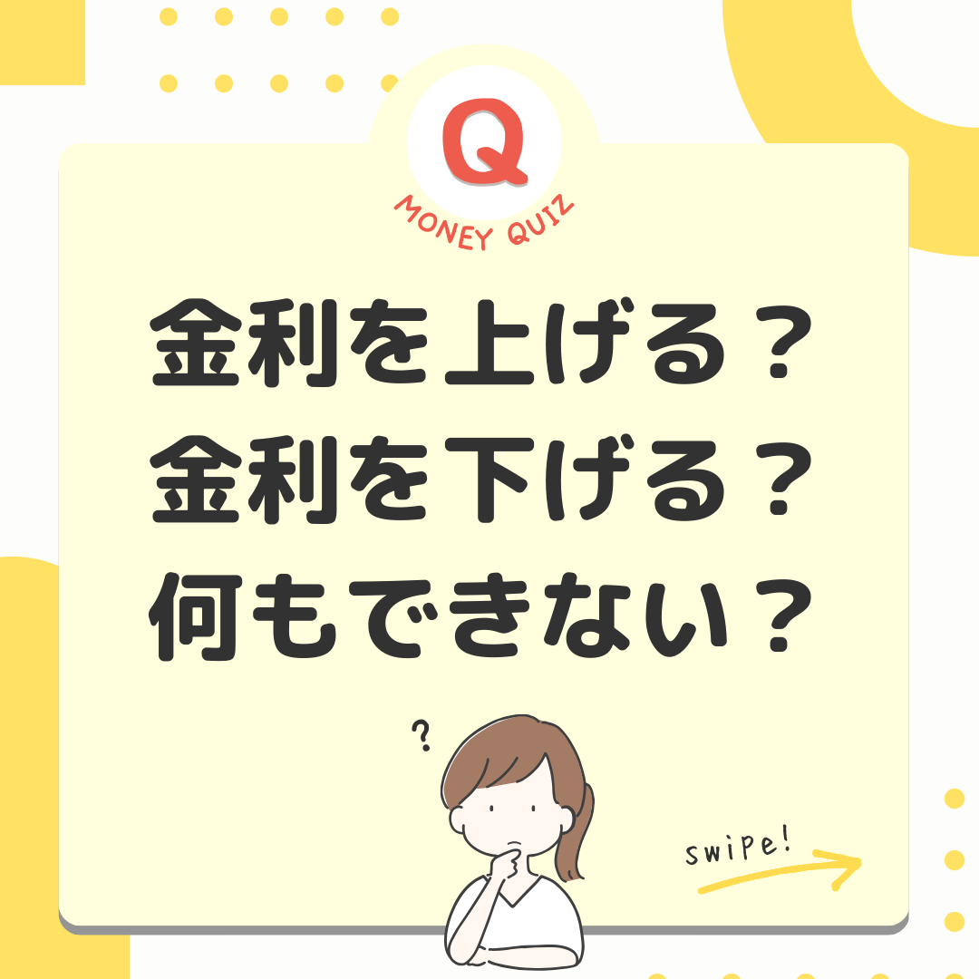 1px 白長引くインフレ、上がらない給与、少しずつ状況は変わりつつありますが家庭には辛い状況が続いています。こんな時、国がインフレ対策としてできることは?金利を上げる?金利を下げる?何もできない?金利を上げる!(金融引き締め)インフレのおさらい・物やサービスの価格が上がる・お金に対する信頼感が低下・需要が供給を上回る・物価上昇と給与上昇が伴えば適度な上昇は経済の成長に良い影響もインフレに対する金融政策・金融引き締め国が金融機関に国債などを売る⇒金融機関は国にお金を払う⇒世の中に流通するお金が減る⇒市場金利が上昇インフレに対する金融政策・金融引き締め金利が上がる⇒高い金利だとお金を借りない⇒買物/投資に使うお金が減る⇒雇用が減り、物が売れなくなる⇒人材が余り、給与が上がらない⇒物の価格が上がらない⇒不景気にインフレに対する個人の対策インフレ下ではお金の価値が下がります。現金をタンスに置いておいたら、金額は変わらないですが、少しずつそのお金の価値は下がります。物価上昇に負けないよう投資をするなどお金の量を増やす工夫が必要です。