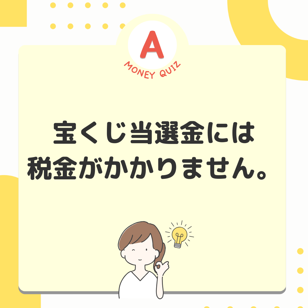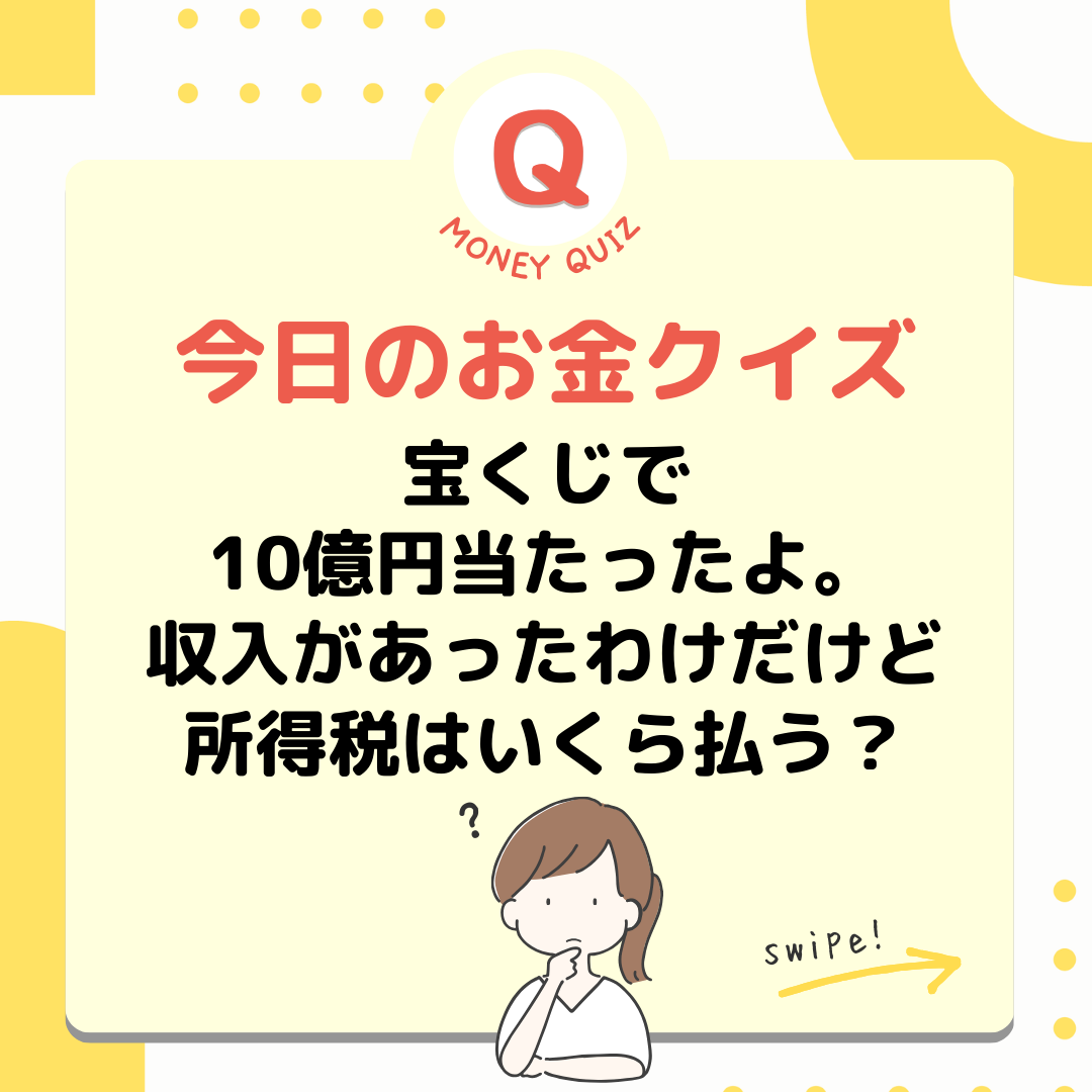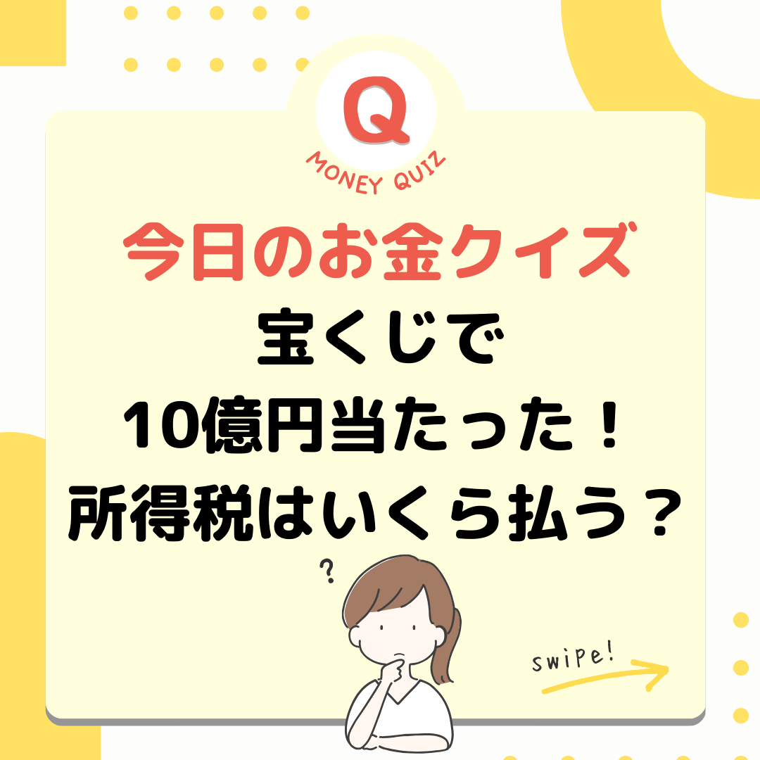 今日のお金クイズ宝くじで10億円当たった!所得税はいくら払う?今日のお金クイズ宝くじで10億円当たったよ。収入があったわけだけど所得税はいくら払う?5,000万円?1億円?0円?0円!宝くじ当選金には税金がかかりません。そもそも宝くじ購入者は税金を支払っているとか、宝くじの公共性とか、理由はいくつかありますが、とにかく税金はかかりません!では、競馬で儲かった場合は?懸賞金が50万円までの場合は税金がかかりません。50万円以上の場合は税金がかかります。その人の年間所得によって税率/税額が変動します。