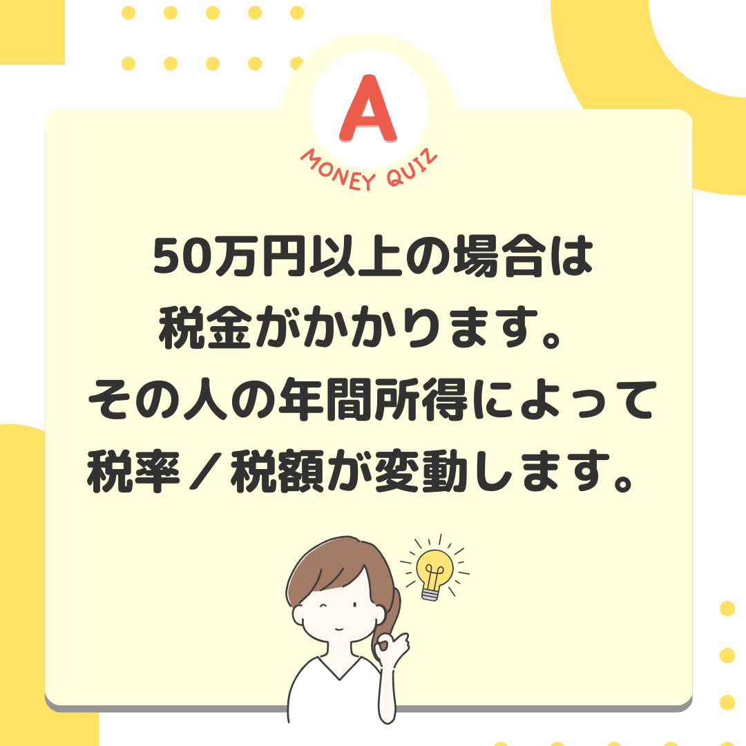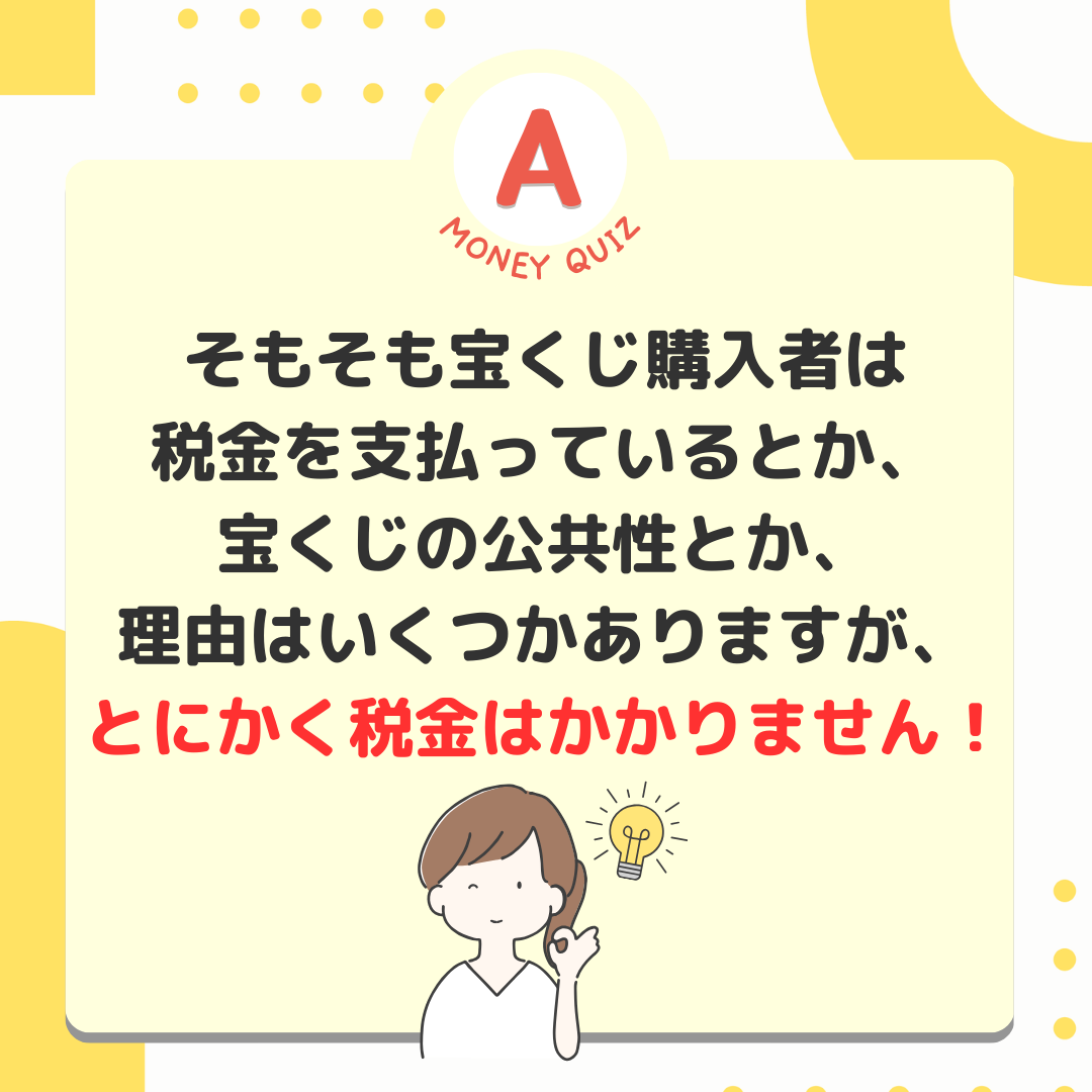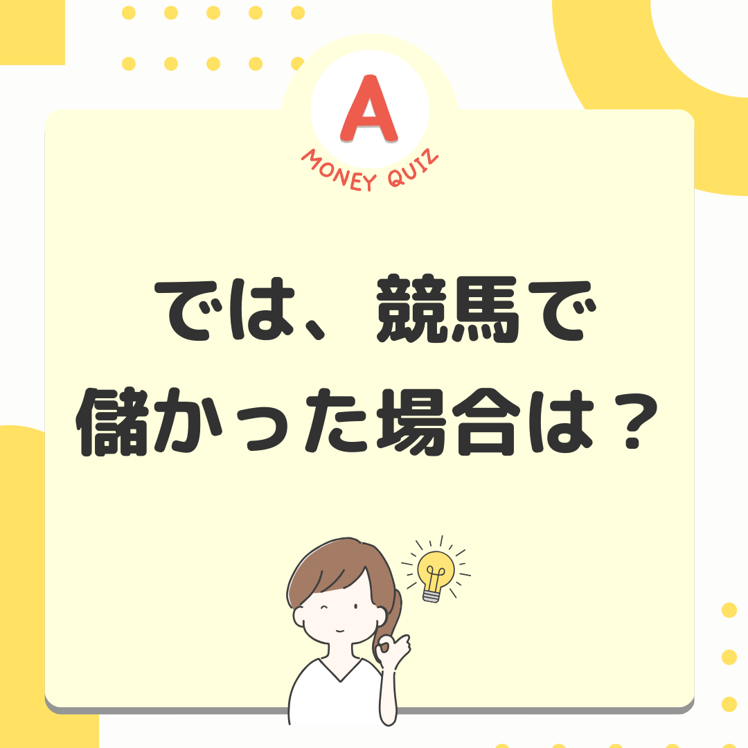 今日のお金クイズ宝くじで10億円当たった!所得税はいくら払う?今日のお金クイズ宝くじで10億円当たったよ。収入があったわけだけど所得税はいくら払う?5,000万円?1億円?0円?0円!宝くじ当選金には税金がかかりません。そもそも宝くじ購入者は税金を支払っているとか、宝くじの公共性とか、理由はいくつかありますが、とにかく税金はかかりません!では、競馬で儲かった場合は?懸賞金が50万円までの場合は税金がかかりません。50万円以上の場合は税金がかかります。その人の年間所得によって税率/税額が変動します。
