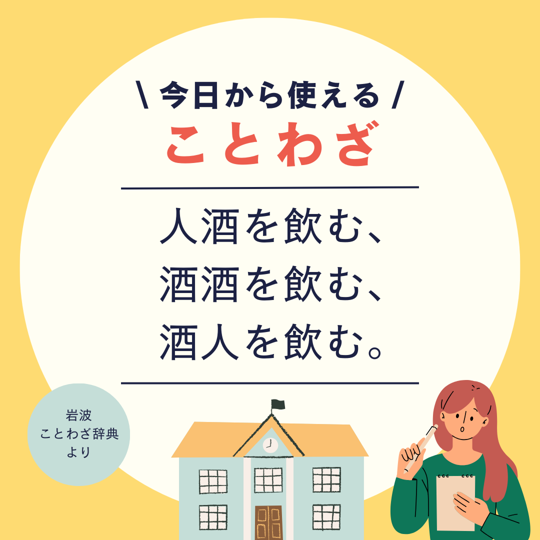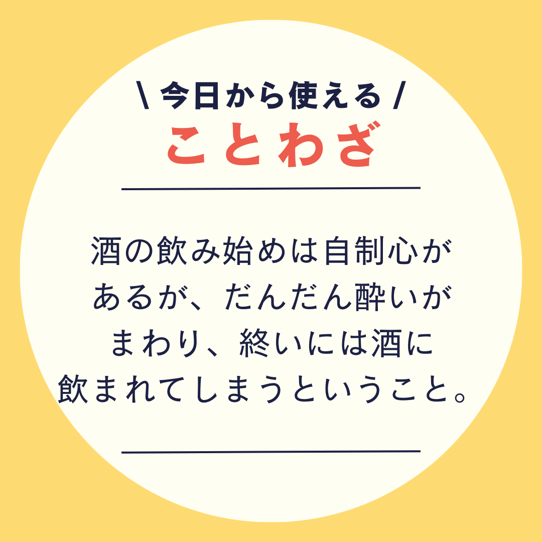 \ 今日から使える /ことわざ人酒を飲む、酒酒を飲む、酒人をむ。\ 今日から使える /ことわざ酒の飲み始めは自制心があるが、だんだん酔いがまわり、終いには酒に飲まれてしまうということ。\ 今日から使える /ことわざ酒に飲まれちゃおしまい!ダサいよ。