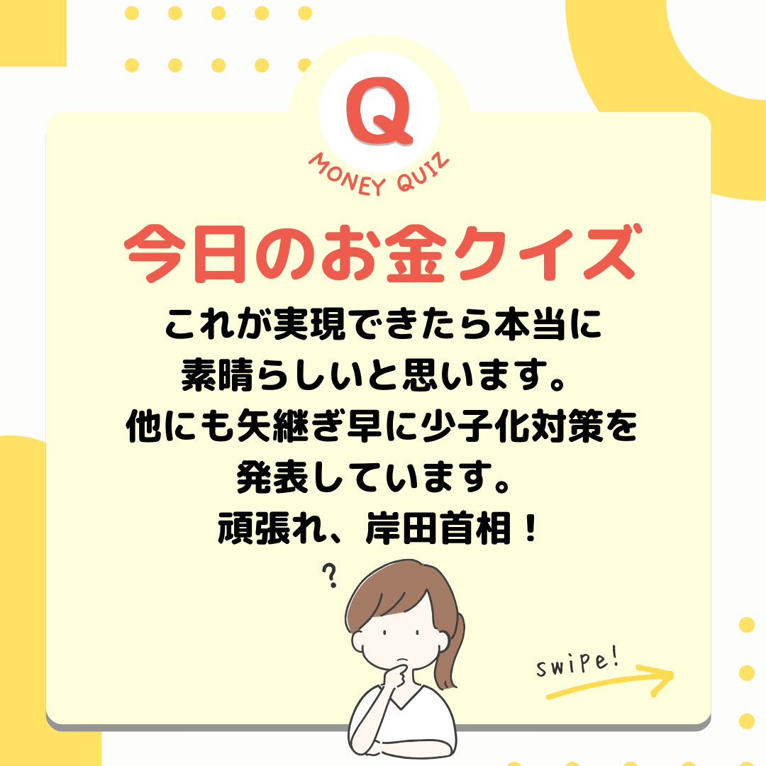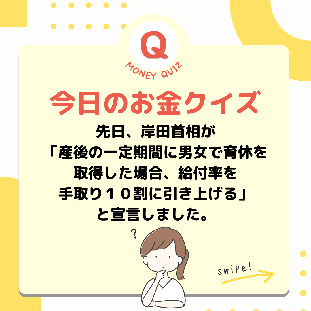 1px 今日のお金クイズ育休中はいくらお給料をもらえる?今日のお金クイズ男性の育休取得が叫ばれていますが浸透は遅々たるもの。仕事上、キャリア上の問題もありますが収入の面でも心配ですよね?育休中はいくらお給料をもらえる?月給の10%?月給の50%?月給の100%?月給の50%!(ただし当初6ヶ月間は月給の3分の2)支給要件満1歳未満の子どもを養育するために育児休業をとった場合パパ・ママ育休プラス制度父母ともに育児休業をとる場合=1歳2ヶ月まで保育所が見つからない場合=2歳まで保険料の免除健康保険料厚生年金保険料被保険者/事業主ともに支払いが免除される今日のお金クイズ先日、岸田首相が「産後の一定期間に男女で育休を取得した場合、給付率を手取り10割に引き上げる」と宣言しました。今日のお金クイズこれが実現できたら本当に素晴らしいと思います。他にも矢継ぎ早に少子化対策を発表しています。頑張れ、岸田首相!