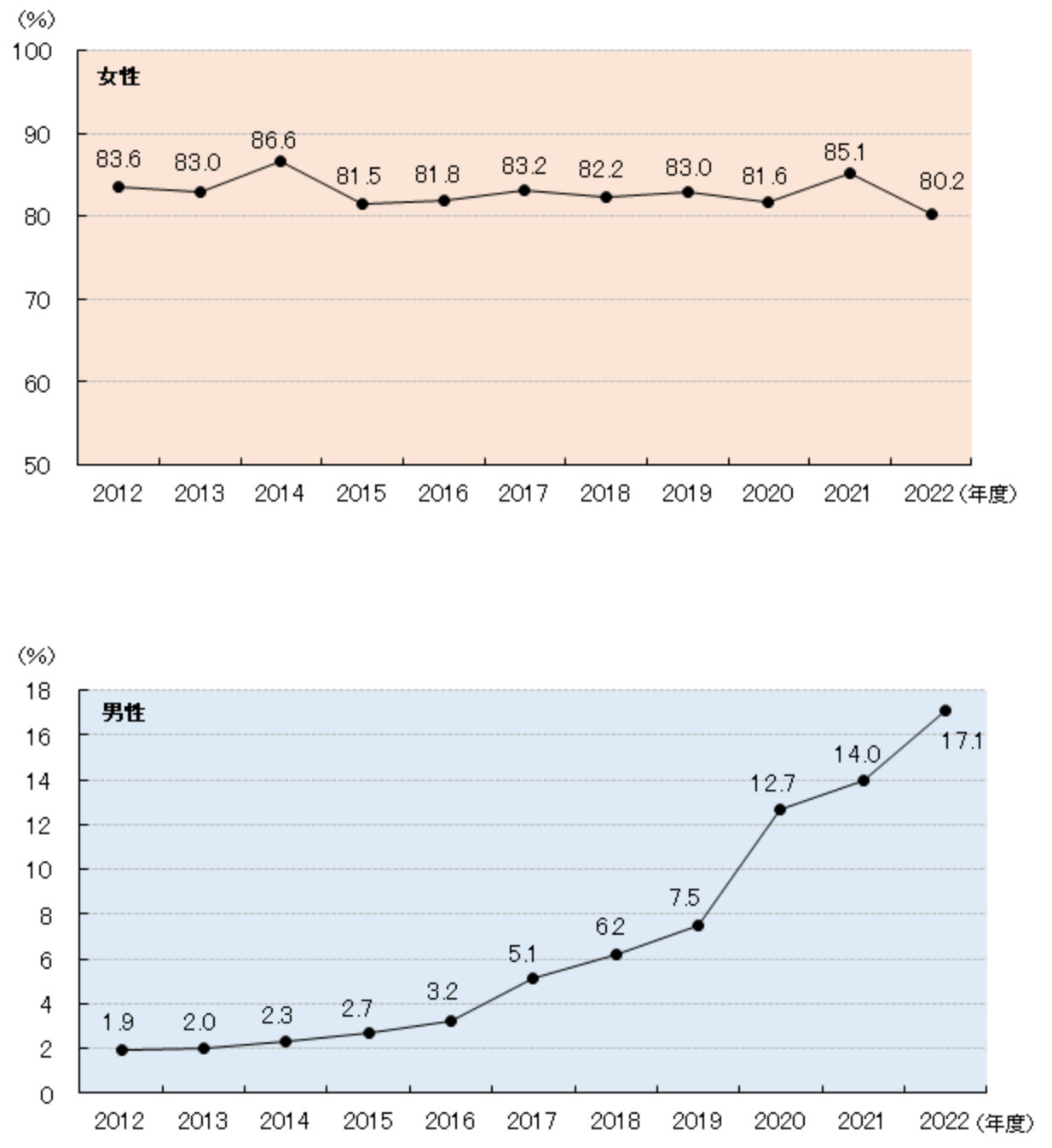 男性の取得率は増加を続けていますが、女性に比べると依然低い割合となっています。