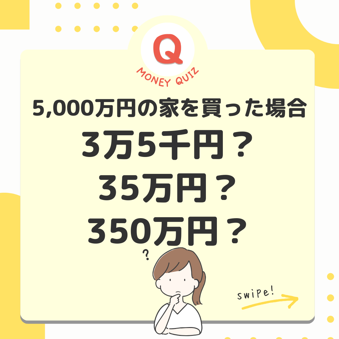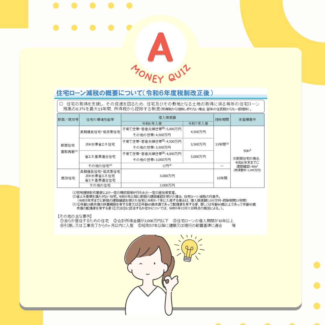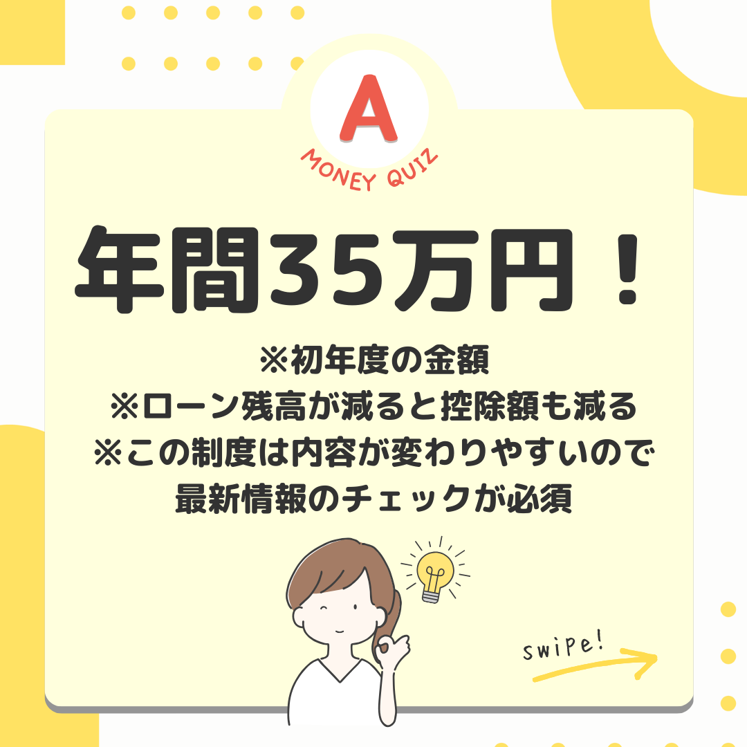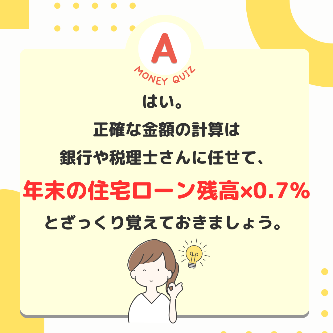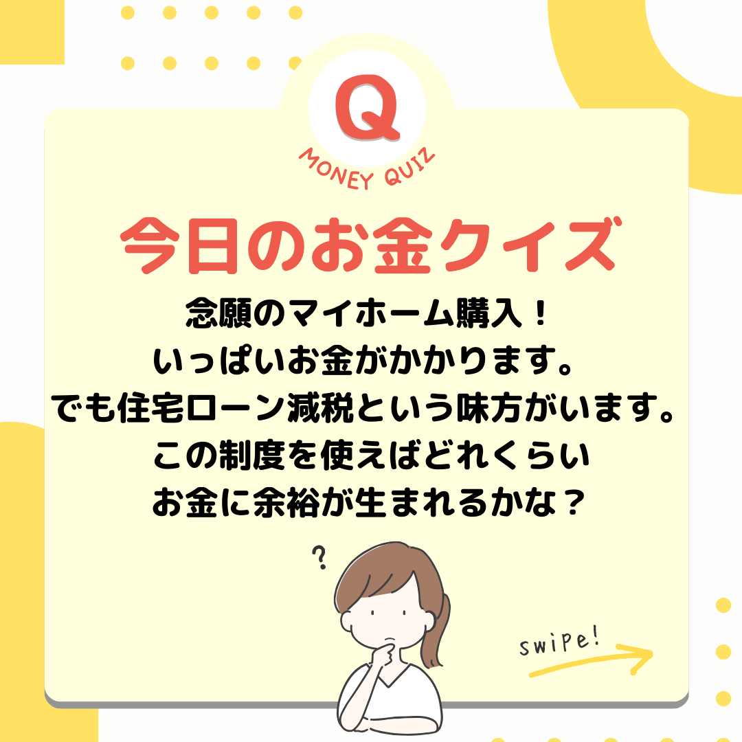 今日のお金クイズあなたは持ち家派?賃貸派?今日のお金クイズ念願のマイホーム購入!いっぱいお金がかかります。でも住宅ローン減税という味方がいます。この制度を使えばどれくらいお金に余裕が生まれるかな?5,000万円の家を買った場合3万5千円?35万円?350万円?年間35万円!※初年度の金額※ローン残高が減ると控除額も減る※この制度は内容が変わりやすいので最新情報のチェックが必須財務省に説明してもらうとこうなります・・・はい。正確な金額の計算は銀行や税理士さんに任せて、年末の住宅ローン残高×0.7%とざっくり覚えておきましょう。