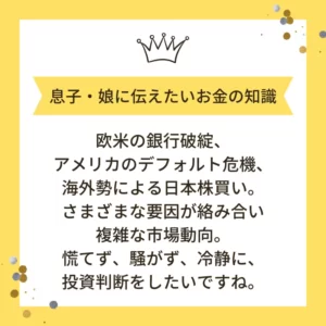 上昇するというレアケースといえるでしょう。今日のお金の知識欧米の銀行破綻、アメリカのデフォルト危機、海外勢による日本株買い。さまざまな要因が絡み合い複雑な市場動向。慌てず、騒がず、冷静に投資判断をしたいですね。