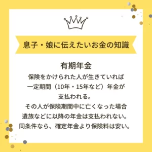 残りの期間は遺族に年金が支払われる。今日のお金の知識 有期年金 保険をかけられた人が生きていれば一定期間(10年・15年など)年金が支払われる。その人が保険期間中に亡くなった場合、遺族などに以降の年金は支払われない。同条件なら、確定年金より保険料は安い。今日のお金の知識 今後、年金制度がどうなるか不透明な時代です。老後の人生を豊かに過ごせるよう早めに個人年金を検討するのも良いことだと思います。残された遺族にも役立つ保険です。