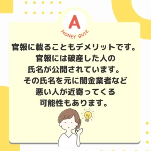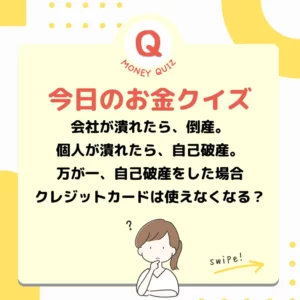 画像内文言(検索用)今日のお金のクイズ クレジットカードの行方は?今日のお金クイズ 会社が潰れたら、倒産。個人が潰れたら、自己破産。万が一、自己破産をした場合、クレジットカードは使えなくなる?今日のお金クイズ 使えなくなる?そのまま使える?たまに使える?今日のお金クイズ 使えなくなる今日のお金クイズ 信用情報機関に名前が登録されるため数年間はクレジットカードの作成や借入、ローンが難しくなります。生活に必要な家財道具等の一定の財産以外は全て失います。今日のお金クイズ官報に載ることもデメリットです。官報には破産した人の氏名が公開されています。