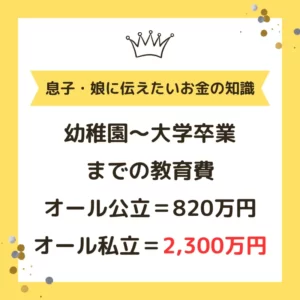 画像内文言(検索用)今日のお金の知識 教育資金の準備今日のお金の知識 幼稚園〜大学卒業までの教育費 オール公立=820万円 オール私立=2,300万円今日のお金の知識 学資保険 子ども保険