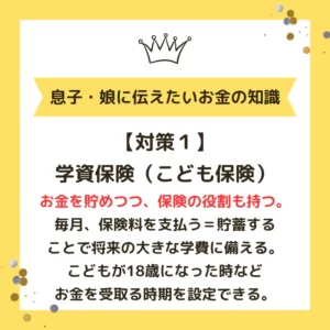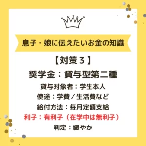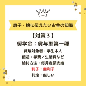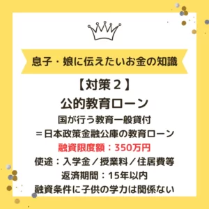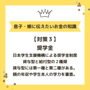 お金を貯めつつ、保険の役割も持つ。毎月、保険料を支払う=貯蓄することで将来の大きな学費に備える。子どもが18歳になった時など、お金を受け取る時期を設定できる今日のお金知識 親に万が一があった時は保険金の支払いが免除され、予定通りの満期金を受け取れる。保険をかけつつ、お金が貯められる。今日のお金の知識 公的教育ローン 国が行う教育一般貸付=日本政策金融公庫の教育ローン 融資限度額:350万円 使途:入学金/授業料/住居費等返済期間:18年以内 融資条件に子どもの学力は関係ない今日のお金の知識 対策3 奨学金 日本学生支援機構による奨学金制度。貸与型と給付型の2種類。貸与型には第一種と第二種がある。親の年収や学生本人の学力を審査。今日のお金の知識 対策3 奨学金:貸与型第一種 貸与対象者:学生本人 使途:学費/生活費など 給付方法:毎月定額支給 利子:無利子 判定:厳しい今日のお金の知識 対策3 奨学金:貸与型第二種