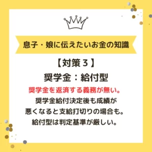 貸与対象者:学生本人 使途:学費/生活費など 給付方法:毎月定額支給 利子:有利子(在学中は無利子) 判定:緩やか今日のお金の知識 対策3 奨学金:給付型 奨学金を返済する義務が無い。奨学金給付決定後も成績が悪くなると支給打ち切りの場合も。給付型は判定基準が厳しい。今日のお金の知識 学びの機会は平等に与えられます。親の財力に寄らず、自分の努力で高等教育を受けることは可能です。ただ、将来的に奨学金返済に苦しむ若者が多いことも事実。奨学金も借金なので、申請は最低限の金額を見極めるのが大事。