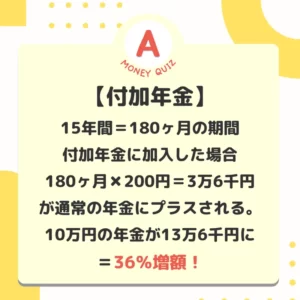 画像内文言(検索用)今日のお金クイズ 年金を増やす方法はあるのか!?無いのか!?今日のお金クイズ 65歳で無事に定年退職。さてさて、老後は何をしようかな?旅行?買い物?趣味?いずれにしても、先立つものが必要。年金を増やす方法は無いのかな?今日のお金のクイズ ある? ない? あるかもしれない?今日のお金クイズ ある!今日のお金クイズ 方法は2つ 年金の繰り下げ受給 付加年金今日のお金クイズ 年金の繰り下げ受給 通常の65歳からの年金支給の開始時期を遅らせることで年金を0.7%増額できる今日のお金クイズ 5年後(50ヶ月後)の70歳から支給開始にした場合60ヶ月×0.7%=42%増額 10万円の年金が14万2千円に今日のお金クイズ 付加年金 この制度は自営業者などの第一号被保険者が対象。毎月400円の保険料を支払うことで付加年金が支給される今日のお金クイズ 15年間=180ヶ月の期間付加年金に加入した場合、180ヶ月×200円=3万6千円が通常の年金にプラスされる。10万円の年金が13万6千円に=36%増額今日のお金クイズ 老後の生活が楽しみな人、そうでもない人。いずれにしてもお金は必要です。辛い老後にしないためにも、やれることはやっておきたいですね。