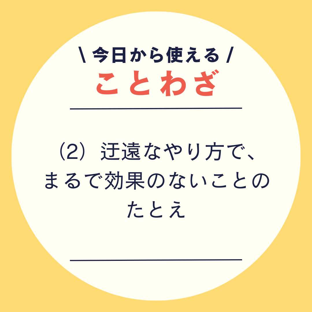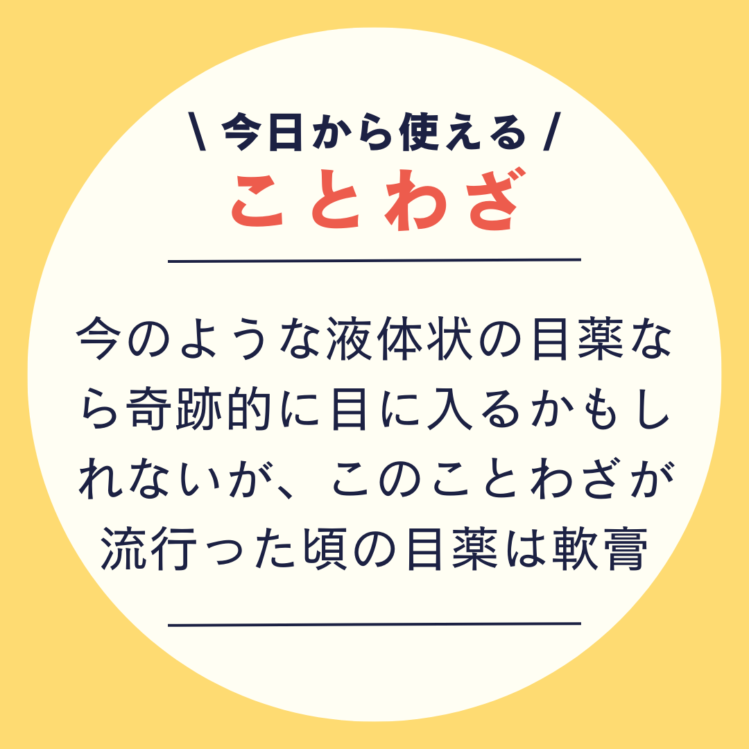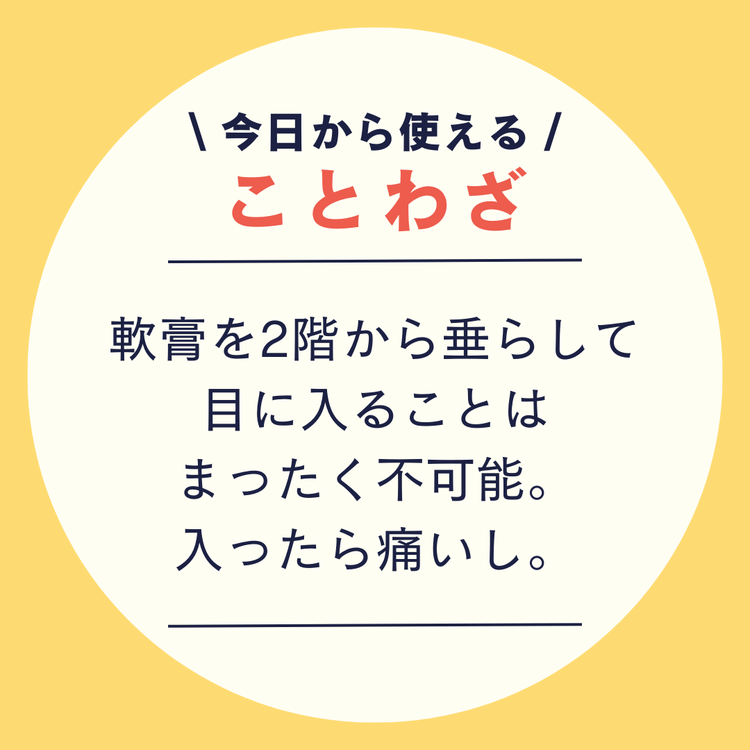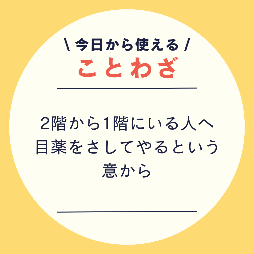 \ 今日から使える /ことわざ2階から目薬\ 今日から使える /ことわざ(1)思うようにことが運ばず、もどかしく感じること\ 今日から使える /ことわざ(2)迂遠なやり方で、まるで効果のないことのたとえ\ 今日から使える /ことわざ2階から1階にいる人へ目薬をさしてやるという意から\ 今日から使える /ことわざ今のような液体状の目薬なら奇跡的に目に入るかもしれないが、このことわざが流行った頃の目薬は軟膏\ 今日から使える /ことわざ軟膏を2階から垂らして目に入ることはまったく不可能。入ったら痛いし。\ 今日から使える /ことわざ無理ゲー!