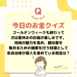 2023年5月29日 / 最終更新日時 : 2024年8月1日 life-tree おかねのクイズ \お金のクイズマニア/【地方税について】観光立国ジャパン コロナ禍が終結しつつあり、各地の 観光地も盛り上がってきました。 より多くの外国人旅行者に来て もらうためにも、観光地の 魅力を高めていく必要があります。