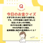 2023年6月1日 / 最終更新日時 : 2024年6月13日 life-tree おかねのクイズ \お金のクイズマニア/【奨学金返済について】娘よ、頑張れ。 我が娘も大学に通うために奨学金を利用しました。本人は【借金をした】ということに非常なプレッシャーを感じています。進学費用を出してあげられればと親としては思いますが、ままならず・・・これも彼女の将来の糧になることを信じてやみません。