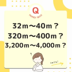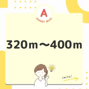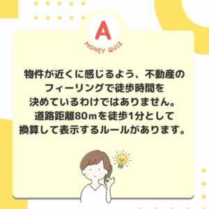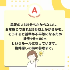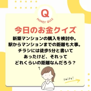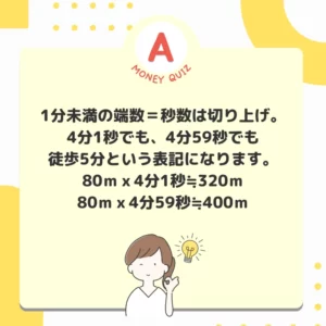 画像内文言(検索用)今日のお金クイズ 歩いて何分?今日のお金クイズ 新築マンションの購入検討中。駅からマンションまでの距離も大事。チラシには徒歩5分と書いてあったけど、それってどれくらいの距離なんだろう?今日のお金クイズ 21〜40m? 320〜400m? 3,200m〜4,000メートル?今日のお金のクイズ320m〜400m今日のお金クイズ 1分未満の端数=秒数は切り上げ。4分1秒でも4分59秒でも徒歩5分という表記になります。80m×4分1秒≒320m 80m×4分59秒≒400m