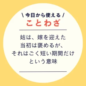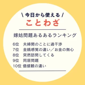 画像内文言(検索用)今日のことわざ 嫁の三日褒め今日のことわざ 姑は、嫁を迎えた当初は褒めるが、それはごく短い期間だけという意味今日のことわざ 三日だけでも褒めてもらえて嬉しかったという人もいるらしい。辛すぎるコメント。今日のことわざ 嫁姑問題あるあるランキング 1位嫌みを言われる 2位子ども=孫のことへの口出し 3位食事の味/好みの違い 4位夫=息子の味方ばかりする 5位姑が自己中心的今日のことわざ 嫁姑問題あるあるランキング 6位夫婦間のことに過干渉