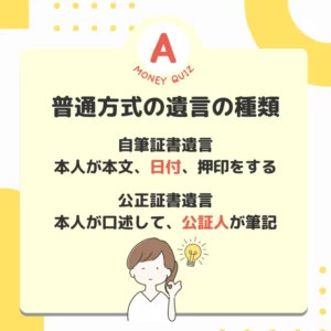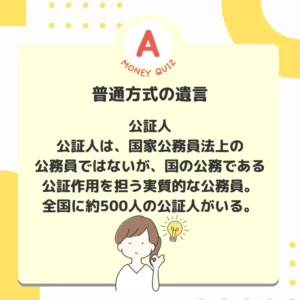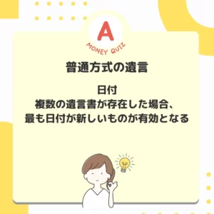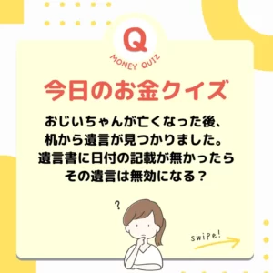 画像内文言(検索用)今日のお金クイズ その遺言は無効か?今日の金クイズ おじいちゃんが亡くなった後、机から遺言書が見つかりました。遺言書に日付の記載が無かったら、その遺言は無効になる?今日のお金クイズ 有効?無効?未来の日付だった?今日のお金クイズ 普通方式の遺言の種類 自筆証書遺言 本人が本文、日付、押印をする公正証書遺言 本人が口述して、公証人が筆記今日のお金クイズ 無効! 未来の日付も無効!今日のお金クイズ 秘密証書遺言本人が作成し、署名、押印して、封印、公証人の前で本人が住所氏名を記入 公証人が日付を記入今日のお金クイズ 普通方式の遺言 日付 複数の遺言書が存在した場合、最も日付が新しい物が有効となる今日のお金クイズ 普通方式の遺言 公証人 公証人は国家公務員法上の公務員ではないが、国の公務である交渉作用を担う実質的な公務員。全国に約500人の公証人がいる。今日のお金クイズ 人生100年時代。遺される人々への最後のメッセージ。正常な判断ができるうちに遺言を作成しておくことも大切なことなのかもしれません。